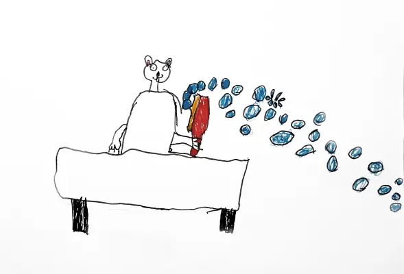 Лерочка придумала медведя, который пришёл к ней на День рождения (а ей как раз совсем недавно исполнилось 5 лет) и надувал много-много мыльных пузырей. Их было так много, что получилась пенная вечеринка.