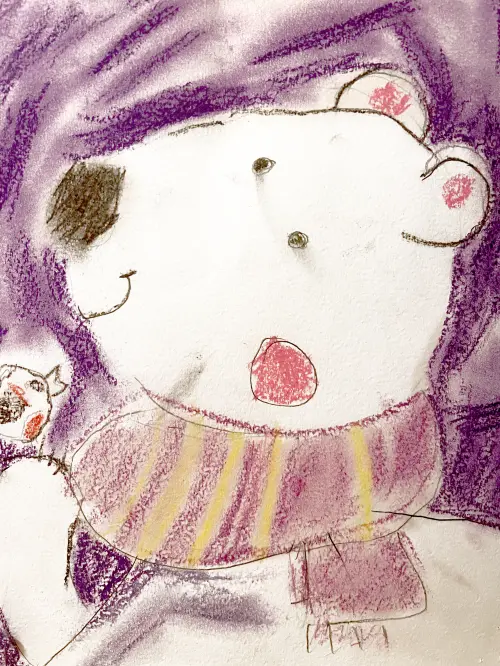 Мой белый медведь большой и сильный. Он дружит с птичкой снегирем. Зимой он носит теплый шарф, который ему связала бабушка. Работа выполнена пастелью.