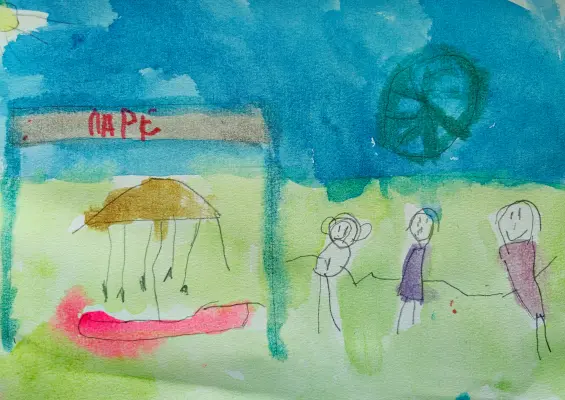 На моей картине мы с мамой и Терпеем идём на аттракционы в Измайловском парке. Мы хотим прокатиться на карусели, а на колесо обозрения пускают только взрослых. Мы покажем медведю мои любимые аттракционы: крутилку-ракушку, машинки и батут. Скорее за билетами!