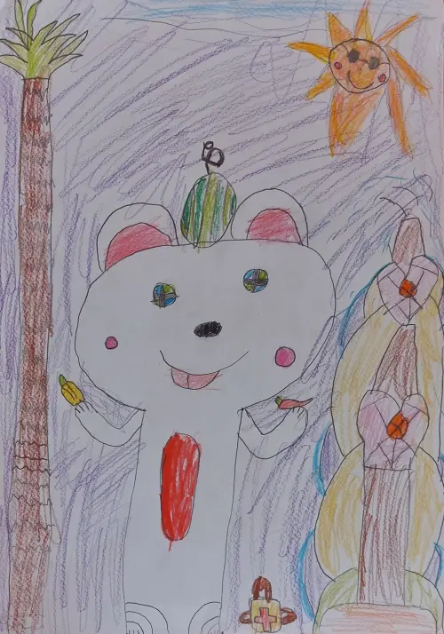 Рисунок нарисован карандашами. На картинке я хотела показать, как Терпей мечтает попасть в теплые края, где много витаминов и теплое яркое солнышко. И белый мишка мечтал увидеть пальму, очень хотел найти себе друзей и оказать им помощь.