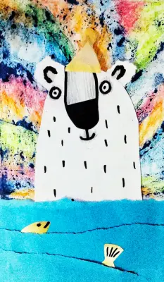 Необычный, яркий и выразительный коллаж изображает белого медведя, выглядывающего из ледяной воды. Его нос и глаза нарисованы с нарочитой простотой, а на голове — желтая шапочка, как символ сурового северного стиля. За его спиной — настоящий взрыв красок, напоминающий сияние северного неба или магическую бурю. Рыбки плывут внизу, добавляя динамики. Это не просто медведь — это хранитель льдов, волшебный персонаж, пришедший к нам из детских фантазий и сказок.