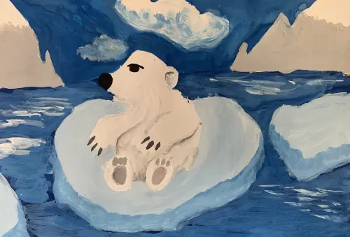 Рисунок, на котором изображён белый медвежонок, стоящий на большой льдине среди голубой воды в вольере Московского зоопарка. Рядом — ещё несколько ледяных глыб и уютная пещера. Медвежонок улыбается, будто рад приветствовать гостей. Рисунок выполнен акварелью