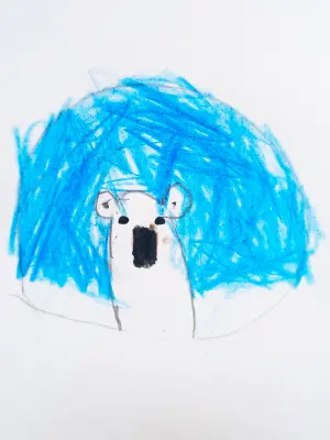 Мне хотелось изобразить медведя Терпея, который с интересом смотрит на нас, зрителей. Заглядывает в камеру объектива на фоне голубого северного неба. Работа выполнена карандашами и фломастерами.