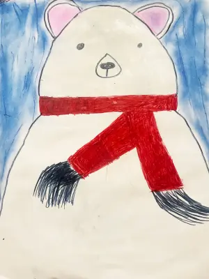 Умка вырос и носит красный шарфик. Он стал смелым и сильным. Мне нравится белый медведь. Я люблю смотреть на них в зоопарке. Я удивляюсь размеру медведя.