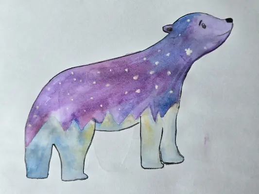 На рисунке изображён белый медведь по имени Терпей, чья шерсть превратилась в живописный пейзаж. Его силуэт плавно перетекает в заснеженные горные вершины, а на спине и боках разворачивается волшебное северное сияние. Этот рисунок символизирует единство природы и её обитателей, где Терпей становится частью величественного северного мира.