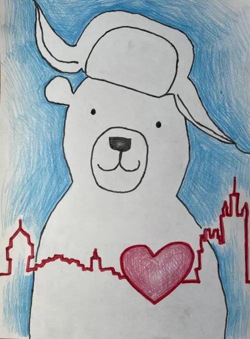 Нужно сказать, что белый медведь - краснокнижное животное, самый крупный наземный хищник. Его ещё называют « хозяин Арктики». Шапка-ушанка на рисунке- напоминание о суровом арктическом климате, а очертания высотки - о местоположении Московского зоопарка. И ещё на рисунке бьётся горячее сердце москвичей, которым так полюбился белый великан.
