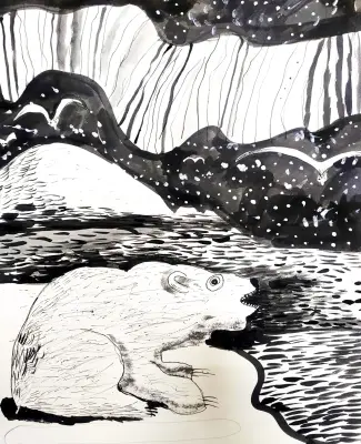 Работа формат А2 тех. тушь перо. На работе изображён белый медведь, сидящий на берегу океана. Над ним северное сияния и айсберг. Наш московский мишка Терпей приехал на каникулы в Арктику и наблюдает за океаном.