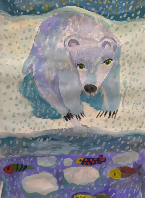 Работа выполнена в технике «гуашь», формат А2. В своей работе Варя изобразила белого медведя Терпея. Мишка стоит в снежной полярной ночью среди бескрайних льдов Арктики. Кажется, он собрался порыбачить. Пушистые снежинки падают на его мягкую, теплую шубку и чёрный нос. А весёлые, разноцветные рыбки шустро проплывают мимо льдинок и дразнят его: «Поймай, поймай нас!»