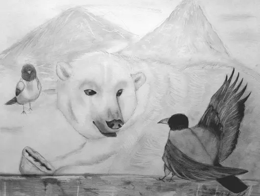 В своей работе я изобразила белого медведя Терпея за обедом. Во время трапезы к нему прилетели две вороны, которые надеются, что им перепадёт что-то от обеда. Данную работу я выполнила карандашом.