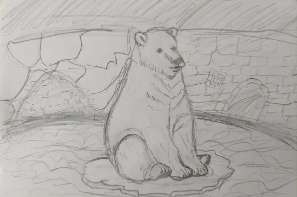 Довольный медведь Терпей проводит своё свободное время - катается на льдине в зоопарке и ему очень нравится это занятие. Работа выполнена простым карандашом.