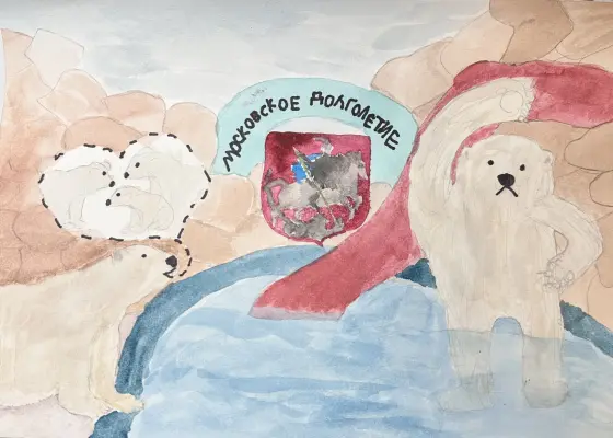 Когда я собралась рисовать белого медведя, сначала я хотела изобразить, как он катается с горки с гербом Москвы в руке. Потом решила узнать поподробнее про медведя Терпея и была очень удивлена. Во-первых, тем, что он любит фрукты, ягоды и овощи. Во-вторых, тем, что его привезли в Московский зоопарк из другого города уже таким большим. А когда я узнала, что медведь Терпей участвует в программе «Благополучие пожилых и беспомощных животных», я сразу подумала про человеческое Московское долголетие. Поэтому у меня и возникла идея нарисовать медведя, делающего зарядку. А еще я замечала, что пожилым людям, часто очень одиноко. Наверное, медведям тоже. Хорошо, что Терпей в зоопарке не один. Я изобразила его соседку, медведицу Айку. Моя работа показывает какие, интересные и полезные для жизни и здоровья жителей и животных реализуются программы в нашем городе.