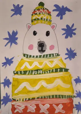 На моем рисунке изображен наш любимый друг - белый медведь Терпей из Московского зоопарка зимой. Он утеплился зимой, идет снег, а на нем - вязаная теплая шапочка и он укутался в вязаный теплый плед. Он сидит и внимательно смотрит на пришедших в зоопарк детей и их родителей.