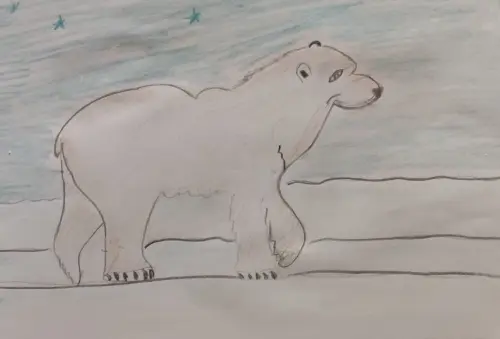Катя любит рисовать цветными карандашами, поэтому медведя Терпея на прогулке она нарисовала цветными карандашами. Мишка гуляет по просторам северного полюса.