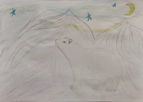 Аня очень старалась нарисовать мишку на зимней ночной прогулке по северному полюсу. Путь ему освещают яркие звезды и луна. Рисунок нарисован и разукрашен цветными карандашами.