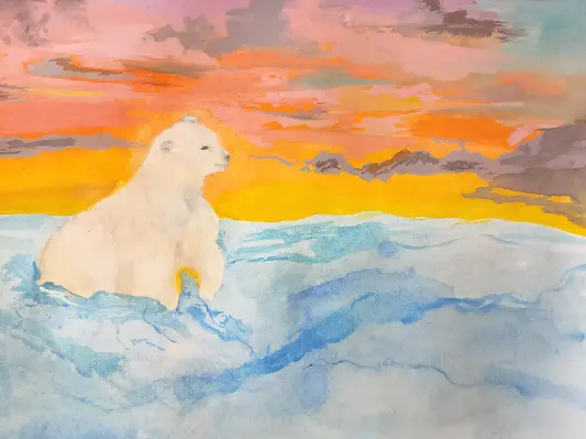 На моей картине я изобразил медведя Терпея на прогулке в Якутии. Солнце уже садится, небо украшено яркими красками. Облака медленно плывут по небу. Медведь сидит в снегу, глядя вдаль на бескрайние просторы природы.