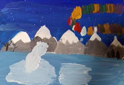 Таисия изобразила белого медведя Терпея в Арктике. Он наблюдает за северным сиянием. Как же прекрасна наша планета! Вокруг заснеженные горы и бесконечная зима. Работа выполнена в технике - гуашь.