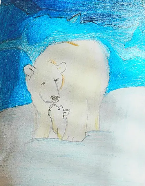 Здравствуйте, недавно были в московском зоопарке и увидели детеныша мишки панды с удовольствием полюбовались милым мишкой Катюшей и она вдохновила меня на этот рисунок, что появилось желание увидеть вживую детеныша белого медведя как на моем рисунке.