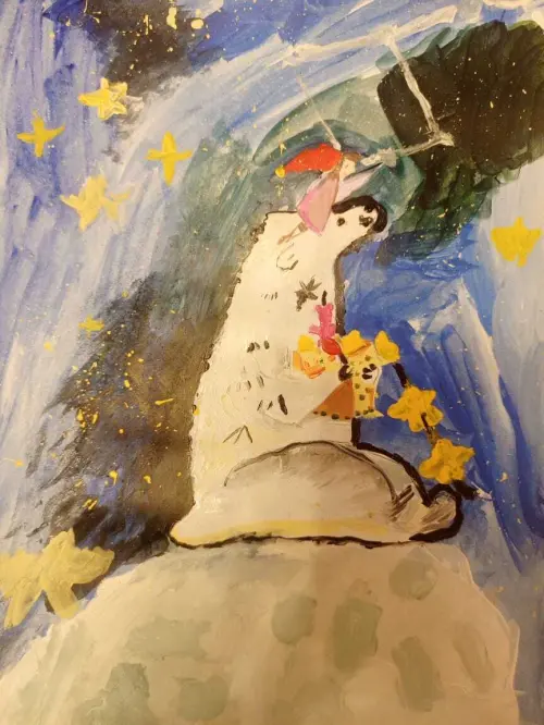 Медведь Терпей сидит на снегу, а у него на голове сидит девочка. А эта девочка собирает созвездие большой медведицы. Медведь рад, что он такой сильный и может помочь девочке.