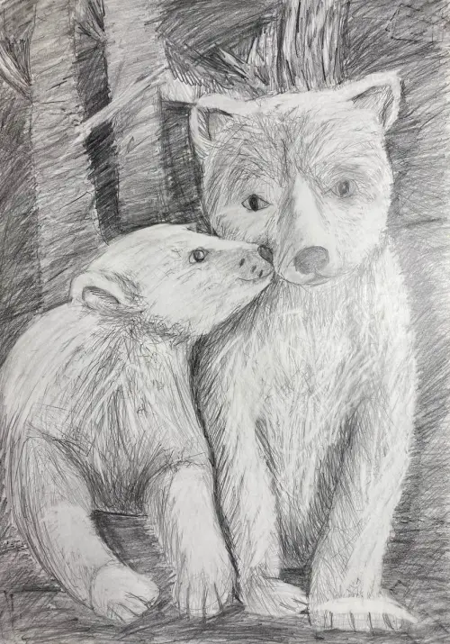 Работа выполнена самостоятельно от руки с использованием карандаша. На ней изображён медведь Терпей из Московского зоопарка со своим возможным будущим ребёнком.
