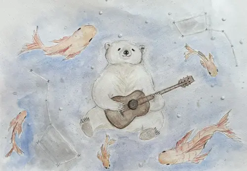 Терпей играет на музыкальном инструменте. Гитара — инструмент для самовыражения и облегчения эмоций, который позволяет выразить грусть или счастье, агрессию или спокойствие без слов. Созвездие Медведицы символизирует вечное и бесконечное.