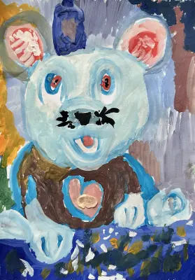 Этот белый медведь живет на Северном полюсе и его зовут Ледяной Медведь. Он любит снег и холод. И он носит шапочку, чтобы не замерзнуть. Еще он любит жвачки - малиновые, клубничные, а особенно медовые. И шоколад А4)) Он на льдине плывет в гости к двоюродной сестричке и брату, и везет им в подарок свои любимые вкусняшки)