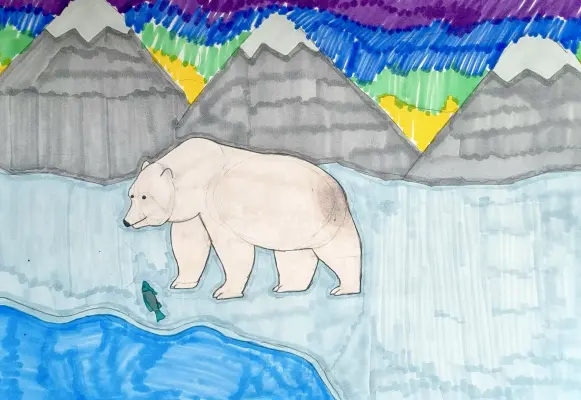 На рисунке я представила как наш сильный, смелый мишка поймал себе на ужин рыбку и решил полакомиться на фоне прекрасного северного сияния и снежных гор.