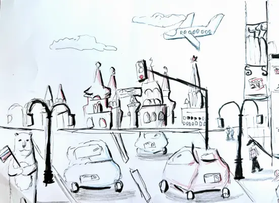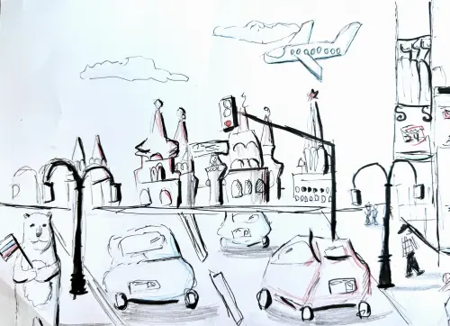 На моей работе изображено как белый мишка Терпей держит флаг России, стоя недалеко от сердца столицы - Красной площади. А мимо него проезжают машины, проходят люди- никто его не замечает.