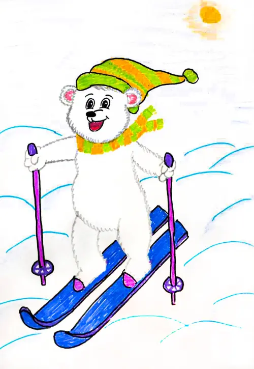 На рисунке с помощью фломастеров и карандашей София изобразила приключения медведя Терпея. Терпей сильный, ловкий, спортивный, катается на лыжах в солнечную морозную погоду.