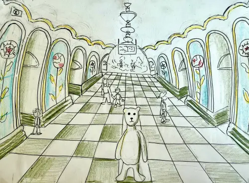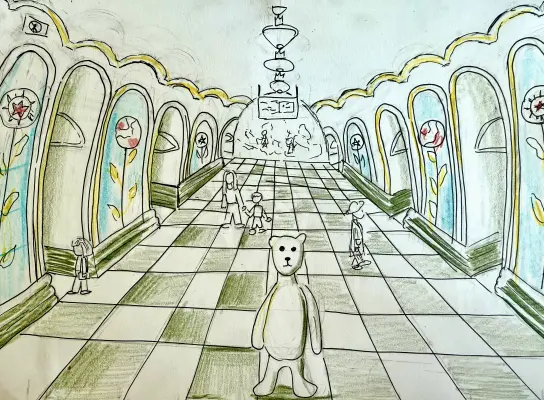 Я нарисовала смелого и сильного белого медведя Терпея в метро Новослободская. Мне кажется, что это самая красивая станция Московского метро и Терпею она бы тоже понравилась.