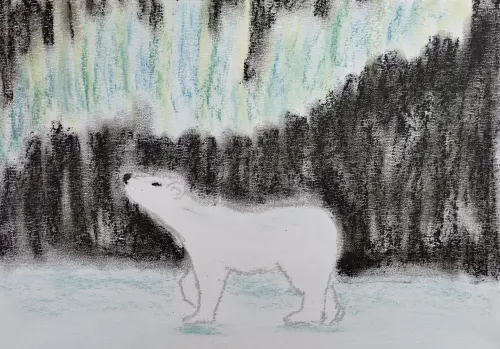 Аня очень любит медведей, поэтому с помощью воспитателей решила нарисовать именно белого Мишку. Рисунок выполнен пастелью с использованием различных цветов.