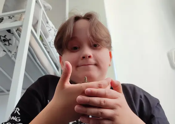 Всем привет, сегодня я вам покажу свою ящер(ицу). Она живет ни в чём не примечательном контейнере, вот крышка вообще страдает, поэтому мы тут всё заклеили скотчем, потому что были бы дырки. Кстати она тут еще камушек нарыла. Вот и теперь она уже поживает. Её или его зовут Саша. У ушей у нее какая-то полосочка. Она у меня с 8 июня, я её забрал и придумал, что у неё 8 июня будет день рождения. Ей год сейчас. 1 год и пять дней. Все нормально, она ест насекомых. Ну и комаров. Когда я ее нашел, она ела муху. Вот так вот. Ладно всем пока.