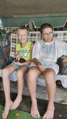 Здравствуйте, нас зовут Лиза и Влад. У нас есть кошка Вася, ей 1 год. Этим летом она родила нам 5 котят. Вася родила их в сарае, под крышей, там тепло и сухо, мы долго их искали. Папа нашел коробку и подстилку, и кошка с котятами стали жить с комфортом.Сначала они жили в сарае и кушали молоко.Когда котята чуть подросли, мы вытащили коробку во двор, в тенёк, и теперь котята гуляют по двору и изучают мир. Они очень весёлые, шустрые и каждый со своим характером. Котята сначала пугались нас и не хотели идти на ручки, но со временем они увидели, что мы заботимся о них, любим их, и они стали доверять нам, спать на наших руках и приходить, когда их зовут. Также котята приходят на зов своей мамы. Когда Вася мяукает, они бегут на ее зов со всех сторон двора. Мы меняем им подстилку, кормим молоком, кашей, сосисками, кормом, сыром. Больше всего они любят кушать сосиски. Мы с сестрой играем с ними, также они любят забраться на Лизу, когда она рисует, и спать. Котята очень дружные, они вместе спят, вместе играют, вместе кушают. Котят зовут Мила, Полосатик, Черныш, Барон, Матроскин.